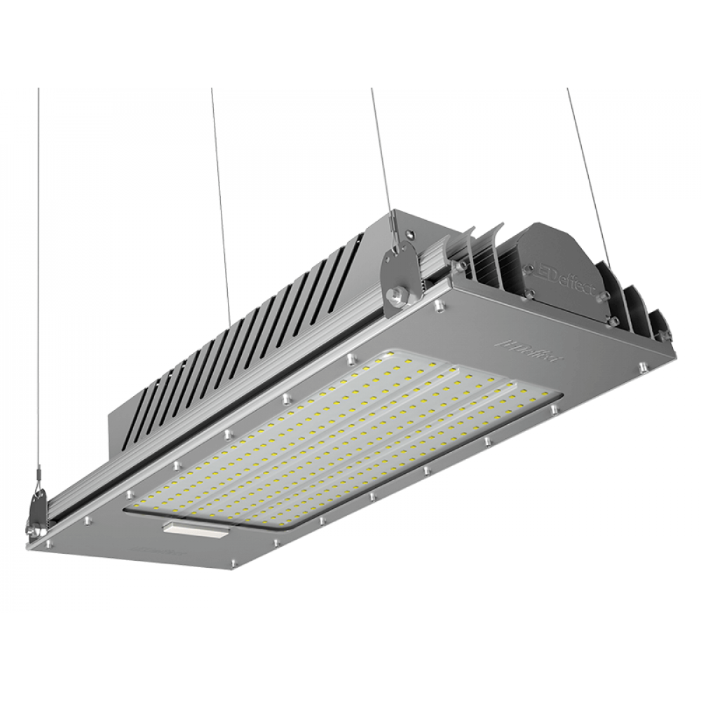 Светильник предназначен для подвесного монтажа на тросы или цепи, предусмотрена продольная регулировка подвесного крепежа.
