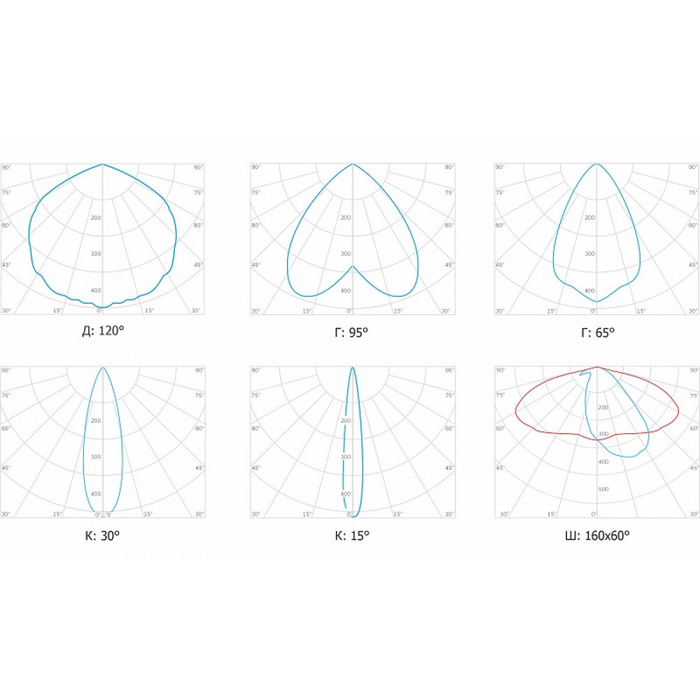 Изготавливается с несколько вариантами КСС на ваш выбор: Д120°, со вторичной оптикой: Г90°; Г65°; К30°; К15°; Ш160х60°.