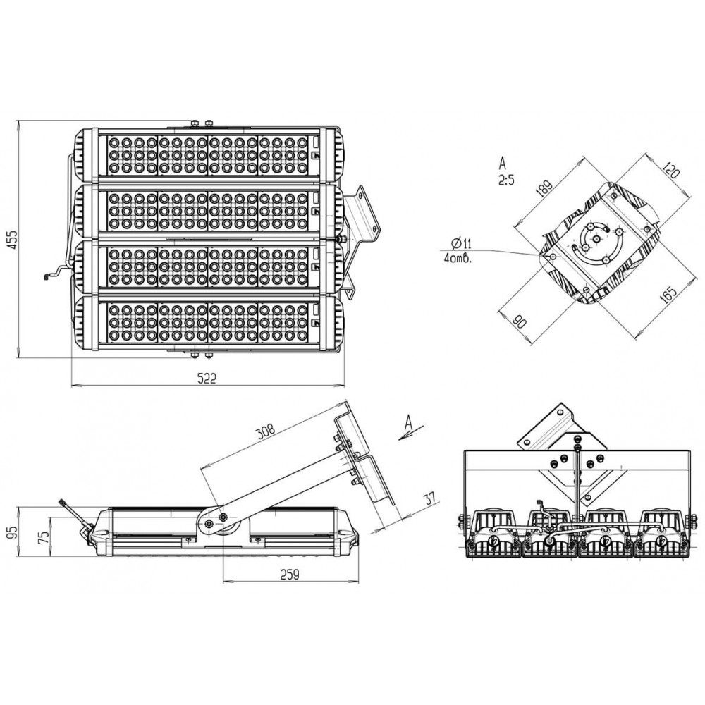 INDUSTRY.3-430-448 Промышленный светильник на скобе мощностью 430 Вт, предназначен для освещения промышленных цехов, ремонтных участков, складских комплексов, эстакад и тоннелей, спортивных залов, торговых и выставочных холлов и др. Поворотный кронштейн (скоба) позволяет размещать светильник, как на вертикальных, так и на горизонтальных (либо расположенных под любым иным углом) поверхностях, а также его надежной фиксации под требуемым углом наклона к плоскости.